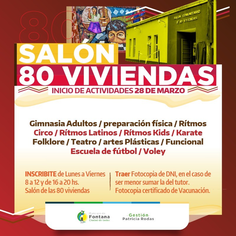 La inscripción se hace de lunes a viernes, de 8 a 12 horas, en el Salón (Entre calle Salta y rio Negro del Barrio las 80 Viviendas). Se debe llevar fotocopia de DNI, en caso de que sea menor de edad del tutor también y certificado de vacunación.